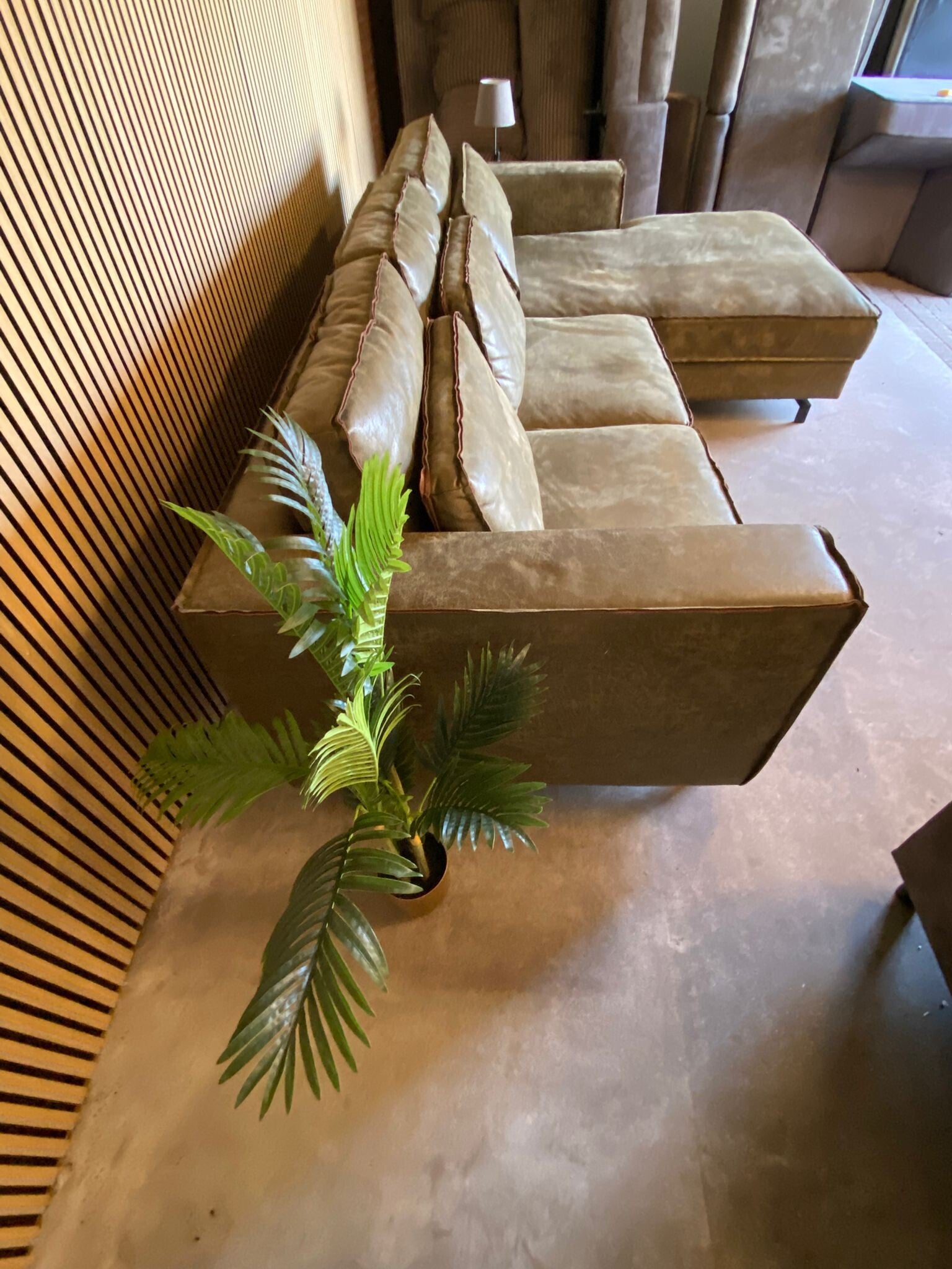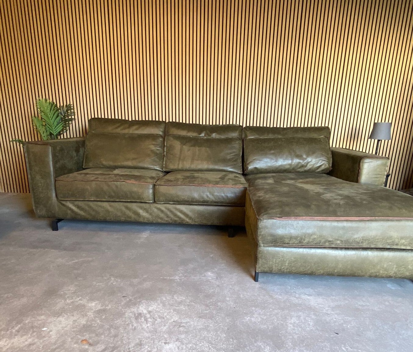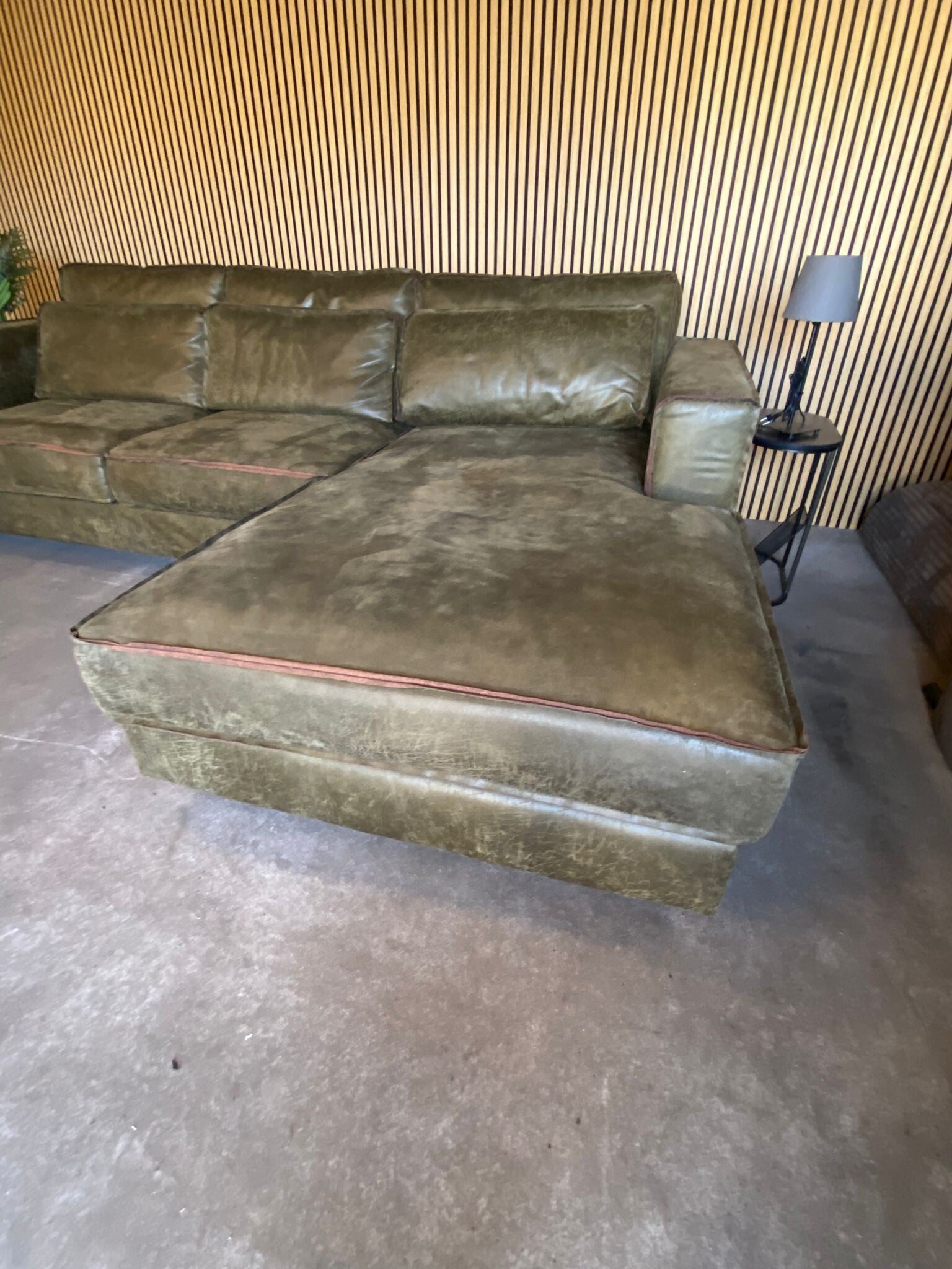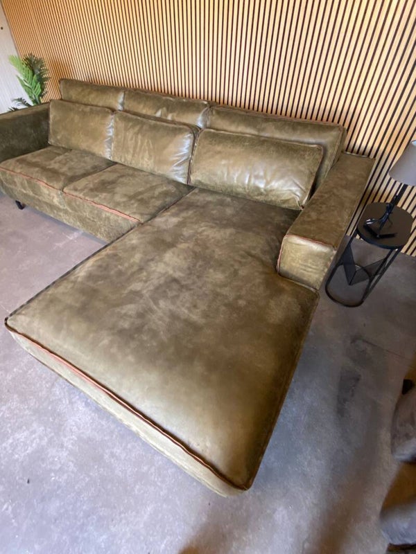 Deze groene hoekbank is gemaakt van microleer wat het onderhoud makkelijk maakt. De bank heeft een stonewash motief, wij noemen dat Stonewash. Hij is professioneel gereinigd en verkeert in nette en goede staat. Een echte eyecatcher. Bestaande uit 2 elementen en alle kussens zijn afneembaar.
