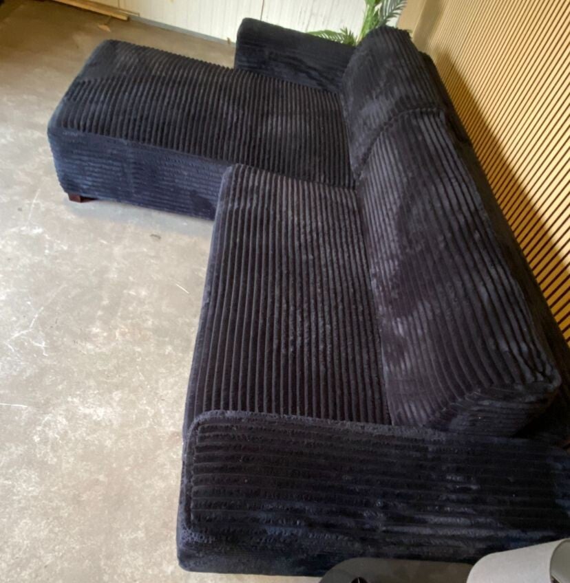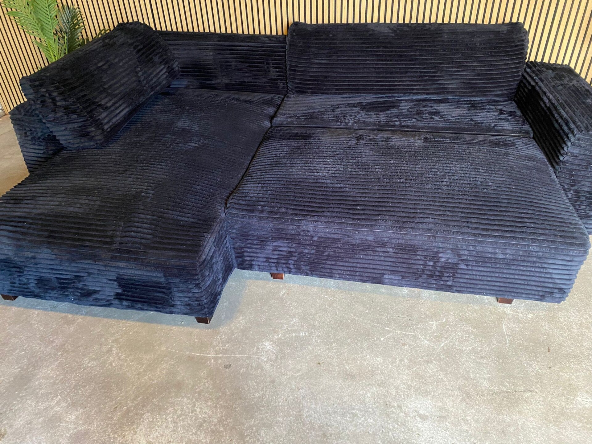 Gisteren binnengekomen en direct gereinigd: deze prachtige zwarte velvet hoekbank met een diepe brede rib. De bank verkeert in hele nette staat, bijna nieuw. De bank is gevoelig voor stofvegen wat inhoudt dat de kleur verandert als je eroverheen wrijft. Het bijzondere is dat je hem om kunt bouwen naar een slaapbank door 2 eenvoudige handelingen. Kortom: een multifunctionele hoek/slaapbank voor een hele nette prijs.