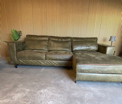 Deze groene hoekbank is gemaakt van microleer wat het onderhoud makkelijk maakt. De bank heeft een stonewash motief, wij noemen dat Stonewash. Hij is professioneel gereinigd en verkeert in nette en goede staat. Een echte eyecatcher. Bestaande uit 2 elementen en alle kussens zijn afneembaar.